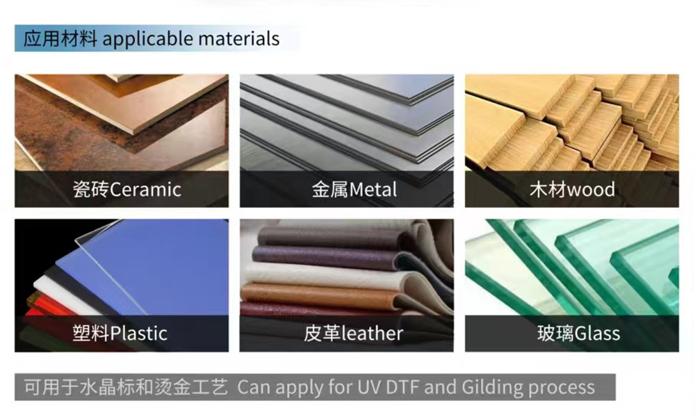 紫外線印刷用材料:PVC,反射フィルム,キャンバス,カーペット,革,ガラス,セラミックタイル,金属,天井,アルミニウム,木材,ドア,アクリルボード,プレキシグラスボード,泡板波紋紙など