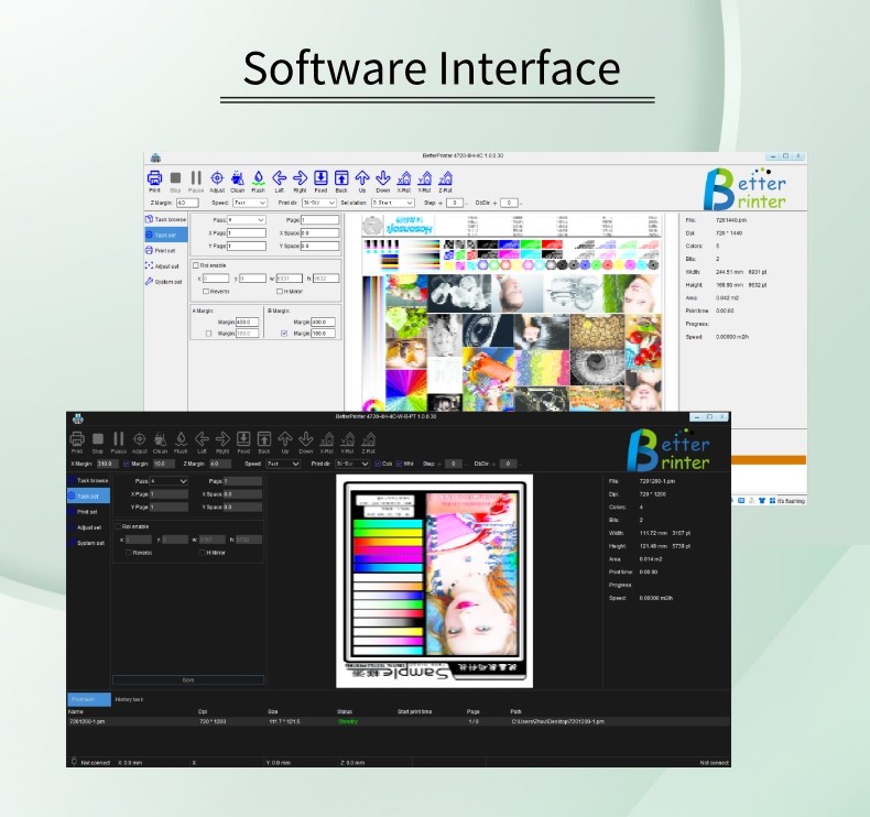 5機能サポート:RIP 機能,多重印刷,多重注文サイクル印刷,抗衝突印刷,自動高さ測定,変化点印刷,機器の電源オフ印刷自動リセット紙不足の検出 インクスタックセルフテストなど