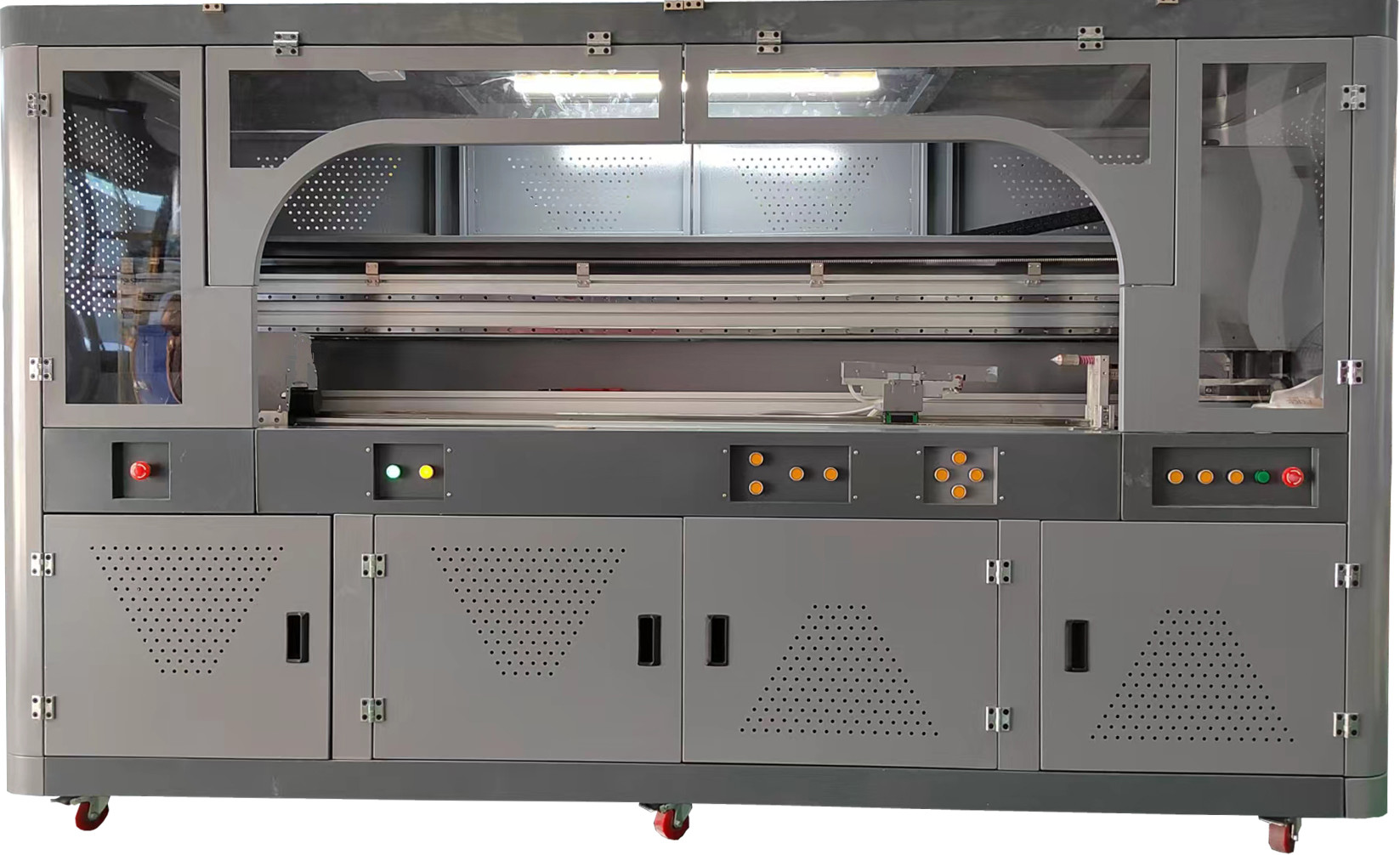シリンダープリンタは,平らな原材料の製品に適用することができます: ポーセランプレート,ガラス,アクリル,PVC,ABS,有機プレート,金属,木材,プラスチック,石,革,建材,装飾材料シリカジェル,3Dステレオスコピー塗装 格子板,格子板,その他のキャンバス,油画キャンバス,ライトボックス布,その他の無制限の原材料,絵画彩色印刷曲がった材料に適用できる製品丸いワインボトル,丸い手芸品のプレゼントなどです.印刷の方向性は正確で,手作業印刷で発生する方向性オフセットの問題は避けられます.
